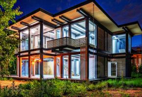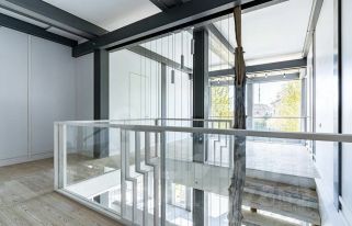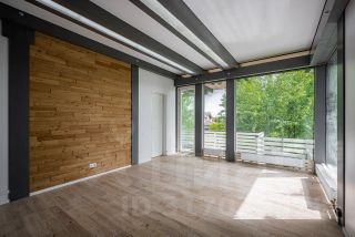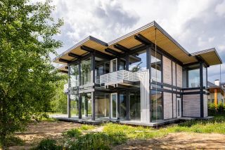 Дом построен по уникальной немецкой технологии фахверк, где каркас выполнен из прочных деревянных балок, а пространство между ними заполнено современными стеклянными стенами, что придает дому стильный и современный вид.