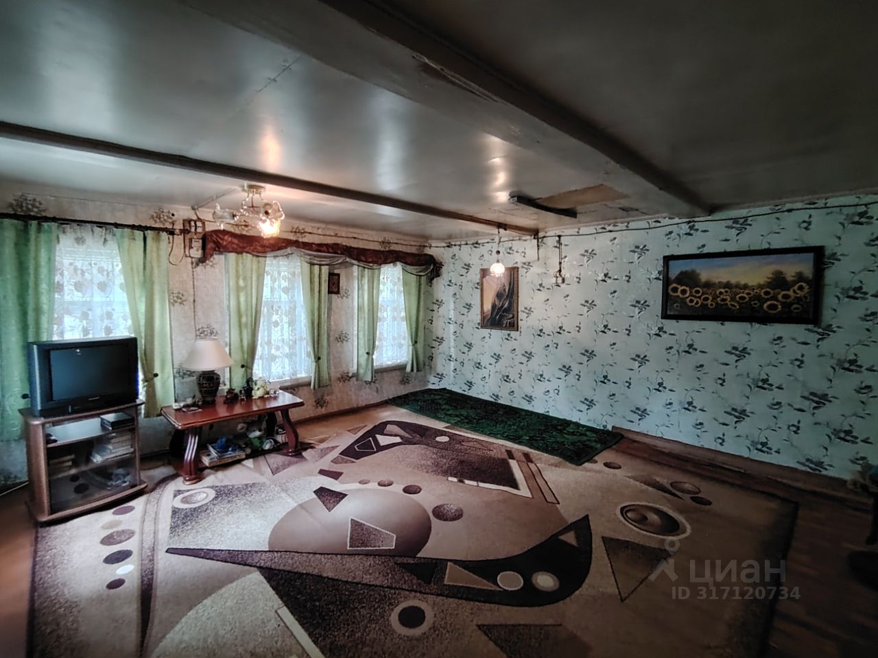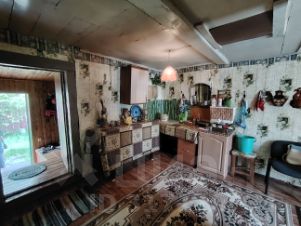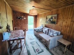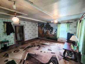 Дом бревенчатый на ленточном фундаменте, отопления нет. Есть большая комната 25 кв.м., маленькая комната обьединенная с кухней, а так же террасса сделанная в 2020г, обшита вагонкой. Окна деревянные, одно пластик, на полу линолеум. Подпола нет. Подведено электричество, газ по границе участка.