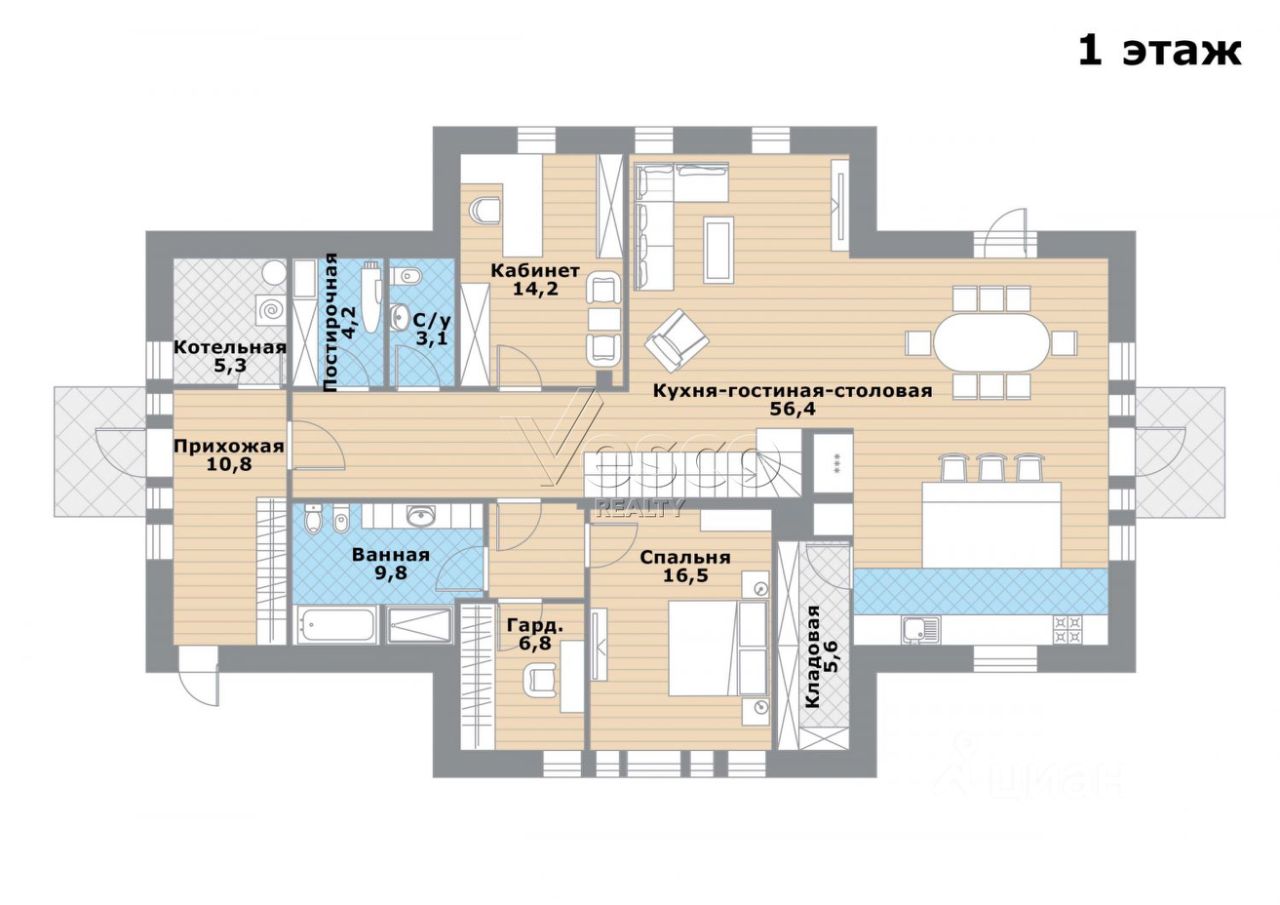 1 этаж (132,7 м²): кухня-столовая-гостиная (56,4), кладовая (5,6), мастер-спальня (16,5) с гардеробной (6,8) и ванной (9,8), кабинет (14,2), санузел (3,1), постирочная (4,2), котельная (5,3), прихожая (10,8).