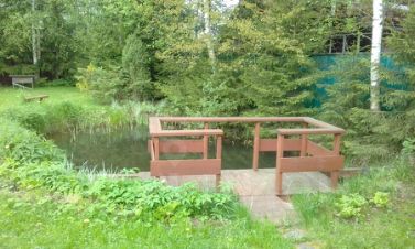 На участке расположены двухэтажная баня, летняя кухня, двухэтажный гараж с навесом, хоз. постройки. Есть свой декоративный прудик с "палубой", где можно запускать рыбу.