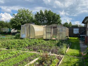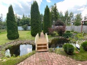 подсобные помещения, теплицы, яблоневый сад, ягодные кустарники, огород, зона отдыха с декоративным прудом, липа, туи, декоративные цветы и кусты. Вода проведена по всей территории сада и огорода.