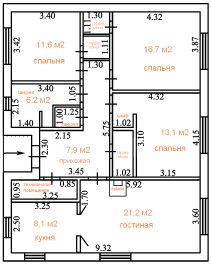 В доме: прихожая, техпомещение, гостиная, кухня (с мебелью и техникой), 3 спальни, 3 гардеробные, 2 санузла (с мебелью и сантехникой) и вывод под камин в гостиной. Под крышей - комната-мансарда 24 кв.м с предчистовой отделкой.