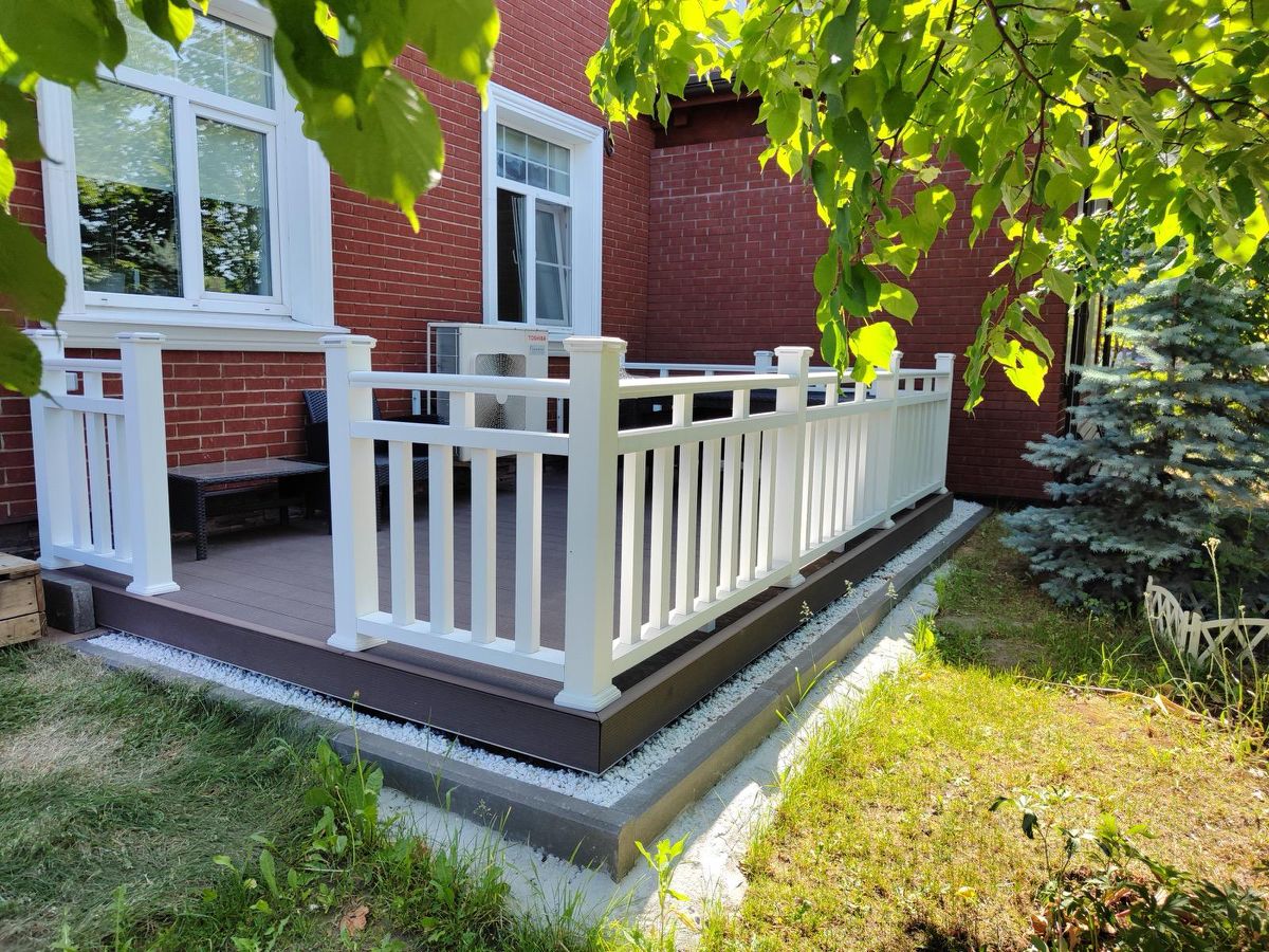 Терраса выполнена из террасной доски, участок обустроен посадками, территория тихая и приватная, улица не проездная.