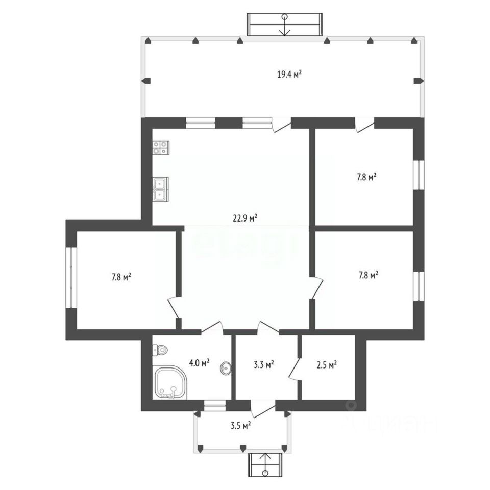 Просторная терраса 19,4 метров, на которую сделан выход из гостиной и одной из спален с панорамными окнами.