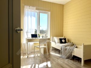 В доме просторная гостиная со вторым светом, три спальни. Высота потолков в гостиной 4,6 м, в остальных комнатах 2,8 м, мансарда высота в коньке 1,8 м. Дом построен недавно и в нем никто не проживал.