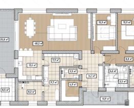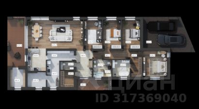 Можно сказать классика из сегмента премиум. Разделена общественная и жилая зоны дома. Мастер блок, кабинет, гладильно-постирочная зона, кладовая при кухне, большая гостиная столовая, две детских, кабинет (можно сделать спальню), три сан-узла, сауна, котельная, гардеробная при входе, просторный хол, кухня.