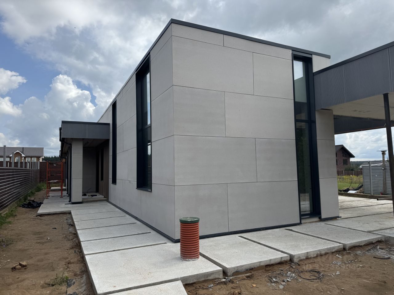 Фасад дома: утепление 50мм Роквул фасадный, не проседает и не даёт теплопатерь. Установлена подсистема для вент фасада и смонтирован широкоформатный фиброцемент (под бетон гладкий полированный, серый на свесах и колонне лениарный).