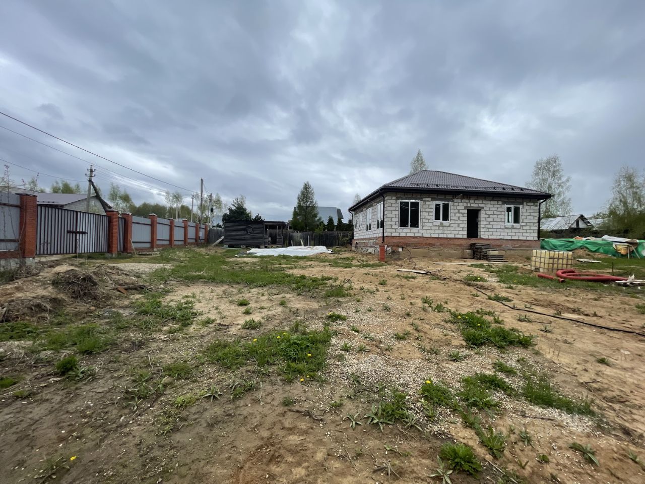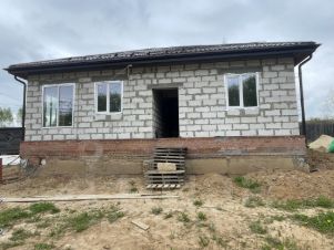 3. Основной этаж (1 этаж) Газоблок. Планировалось: прихожая/тамбур, коридор, раздельный санузел, две полноценные комнаты, и просторная кухня-гостиная, через которую имеется проход к лестнице на -1 этаж. Высота потолков 3 м. Временное освещение и розетки для строительных работ проведены.