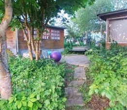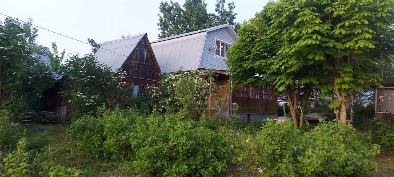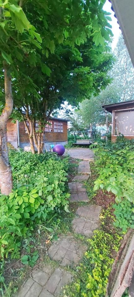 Участок площадью 8,5 соток. На участке плодовые деревья, кустарники. Между домом и баней плитка. Установлены садовые качели для троих. Также на участке есть маленький гостевой домик, баня и веранда с хозблоком.
