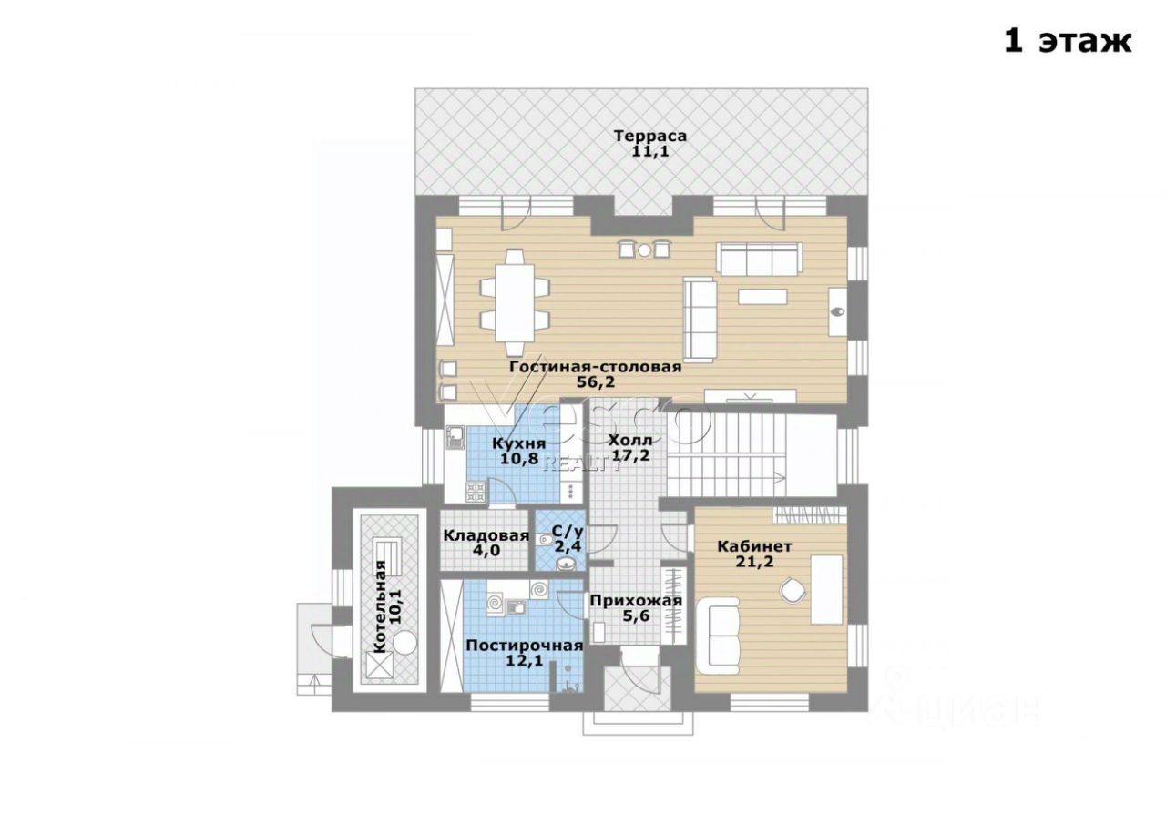 1 этаж: гостиная-столовая (56,2) с выходом на террасу (11,1), кухня (10,8) с кладовой (4), кабинет (21,2), постирочная с душем (12,1), прихожая (5,6), холл (17,2), с/у (2,4).