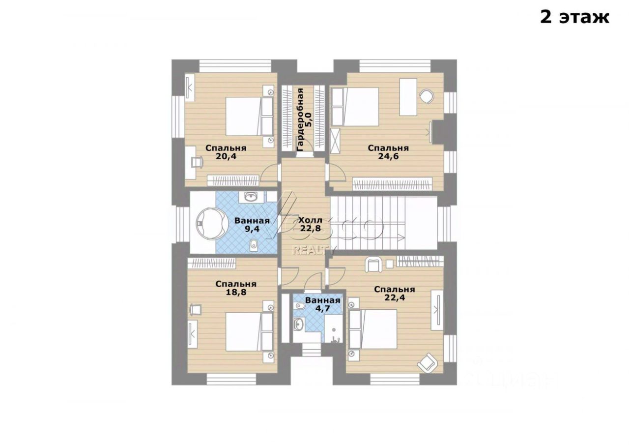 2 этаж: спальня 1 (24,6), спальня 2 (22,4), спальня 3 (20,4), спальня 4 (18,8), гардеробная (5), 2 ванные комнаты (4,7 и 9,4), холл (22,8).