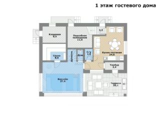 1 этаж: кухня-гостиная (24,6) с выходом на террасу (20,1), бассейн (27,6), русская баня на дровах (8,6), подсобное помещение (11,6), кладовая (8,5), тамбур (2,4), с/у (1,9).