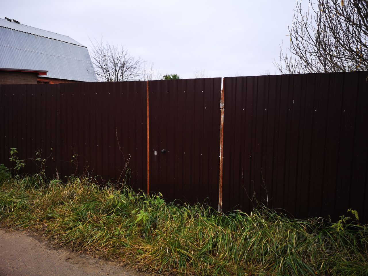 По периметру огорожен забором с лицевой стороны из металлопрофиля с калиткой и распашными воротами.