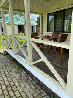 К дому пристроена открытая веранда, где можно с удовольствием позавтракать, провести вечер за ужином со свечами, любуясь видом на цветник, огороженный туями и можжевельниками.