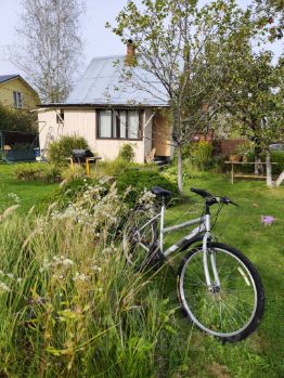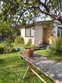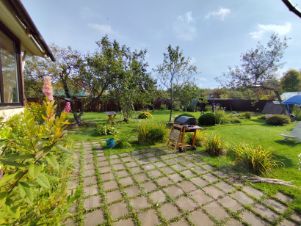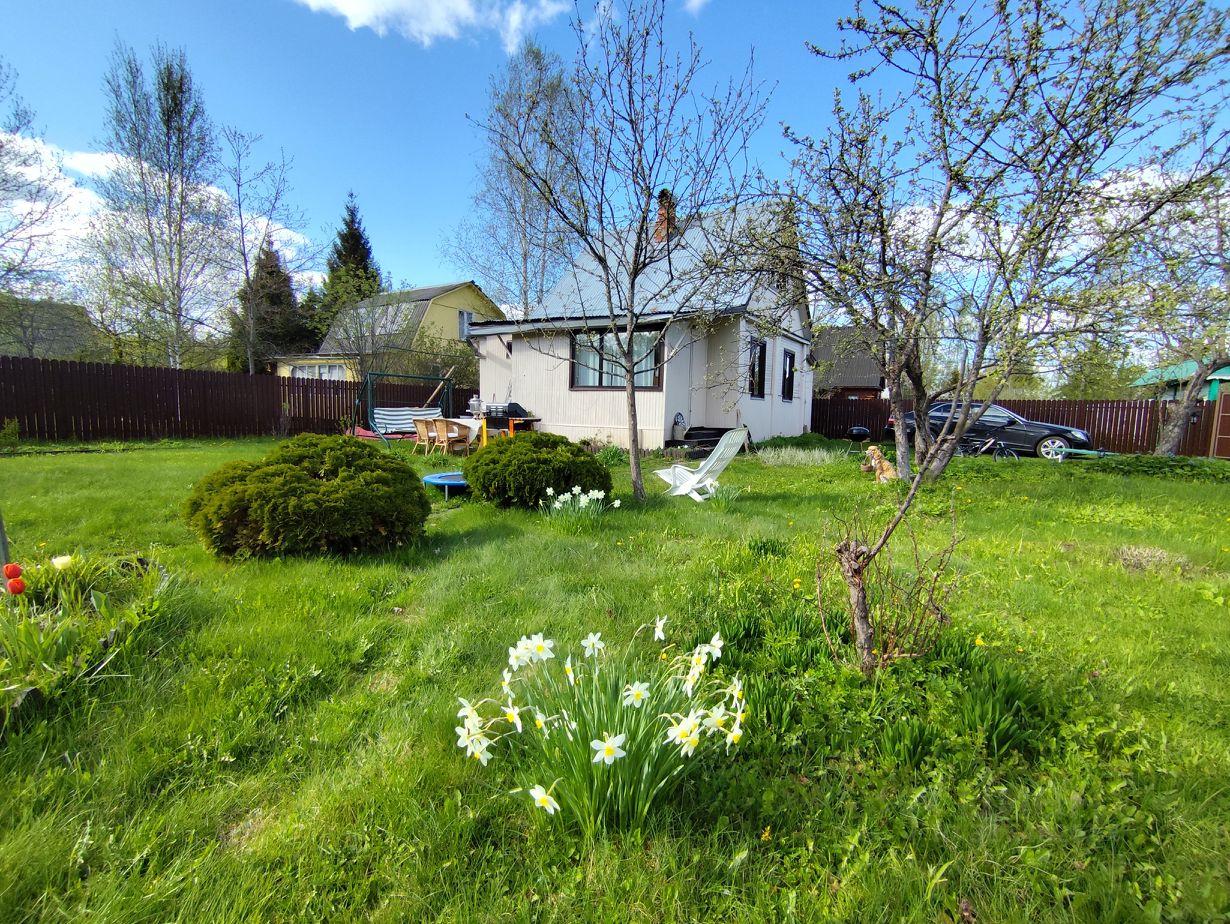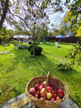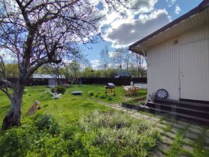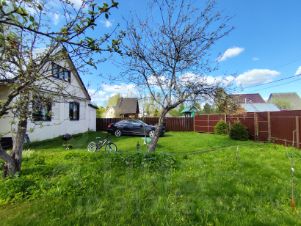 Земельный участок ухоженный, правильной формы, ограждён забором, весь утопает в зелени: фруктовые деревья и кусты, площадка для парковки автомобиля, место для постройки гаража и хозпостроек.