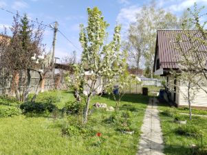 На участке растут хвойные, плодовые деревья, кустарники, цветы, выложены дорожки и выполнено освещение.