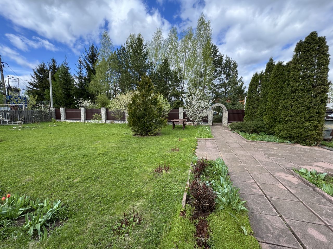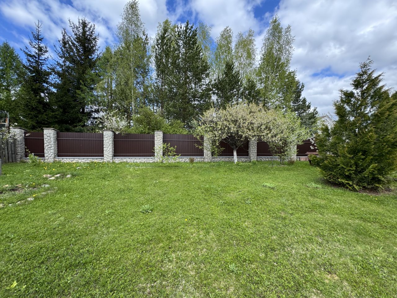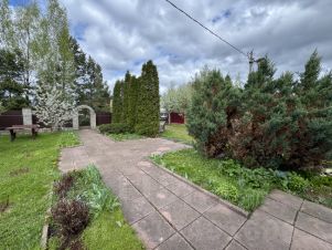 Земельный участок 18.3 сотки, ухоженный, ровный, прямоугольной формы, со всех сторон огорожен забором, въездная группа оборудована воротами и калиткой, фасадная часть обнесена забором с кирпичными столбами на ленточном фундаменте. Дорожки по участку выложены тротуарной плиткой. Посажены плодовые и хвойные деревья, кустарники.