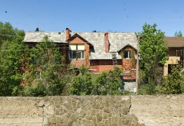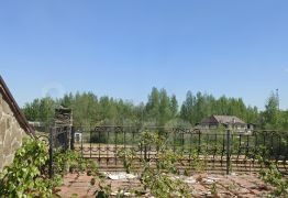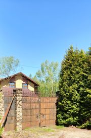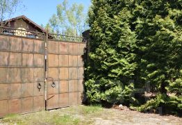 На участке высажены туи рядом с входом в здание и воротами. Участок с двух сторон ограничен высоким бетонным забором, большими металлическими воротами на въезде.