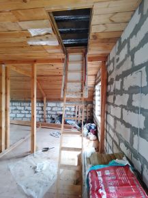 Второй этаж размечен на 3 комнаты, стены не зашиты.