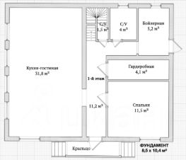 Первый этаж: просторная кухня-гостиная, гардеробная, спальня, раздельный санузел, бойлерная с выходом на участок.
