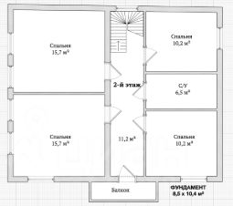 Второй этаж: 4 спальни, совмещенный санузел с ванной, открытый балкон, выход на мансарду свободного назначения.