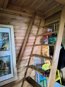 Рядом с домом есть пристройка - баня. Баня двухэтажная. На первом этаже душ, далее сама баня и есть целая большая спальня с камином. Присутствует второй этаж, там мы сделали склад нужных вещей, но при желании можно сделать целую спальную комнату.