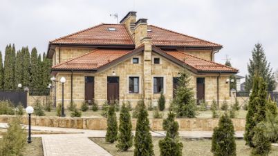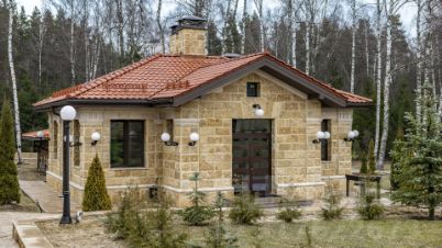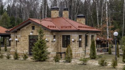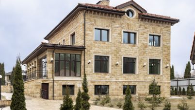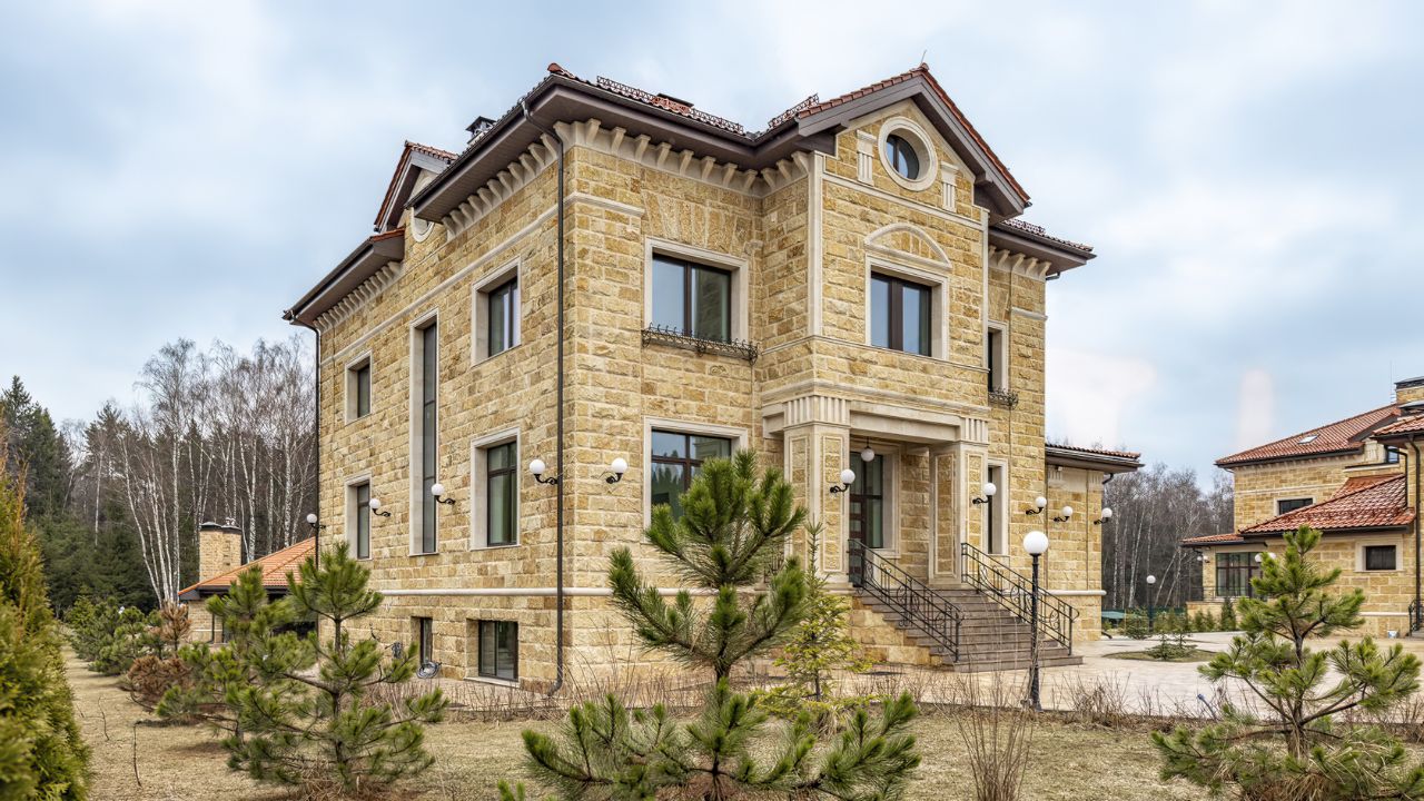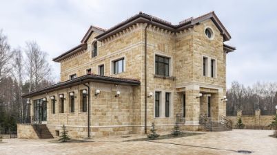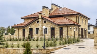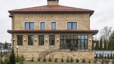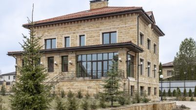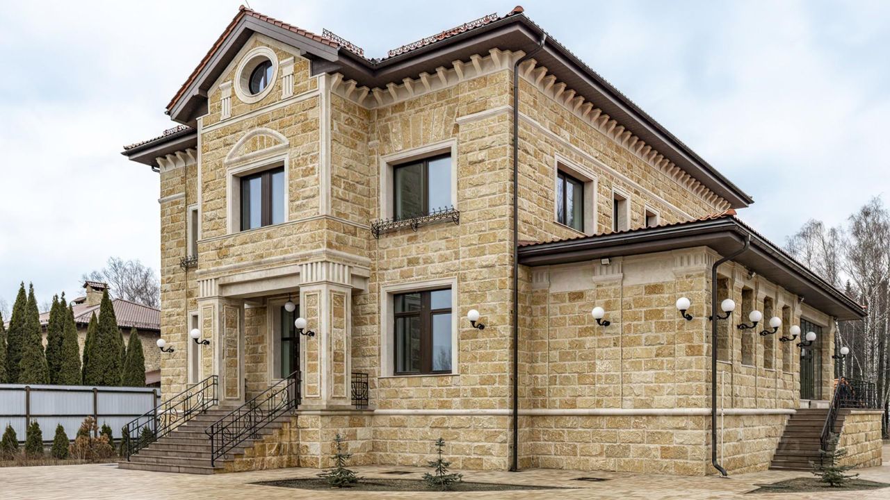 Здания спроектированы в едином классическом стиле, в отделке использован кирпич теплого песочного оттенка. Окна с темными рамами обрамлены наличниками, подчеркивающими строгость и симметрию архитектуры. Центральный вход выделяется массивным портиком с колоннами, органично вписывающимися в общую композицию. Фронтон украшен лепниной, а красная черепичная крыша эффектно контрастирует с основным тоном, завершая гармоничный облик.