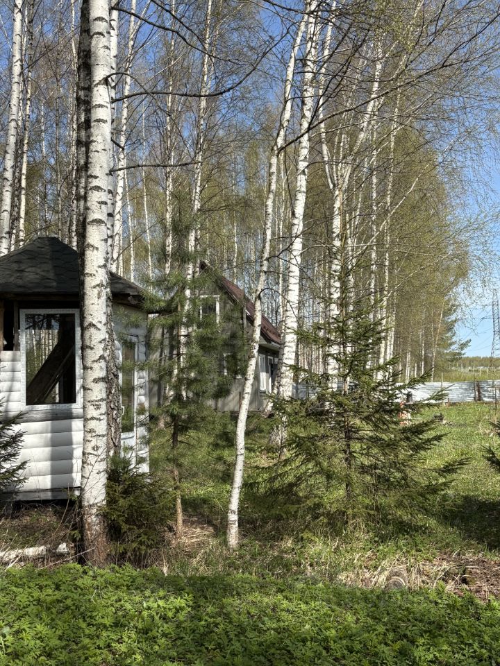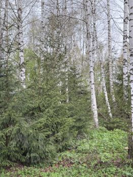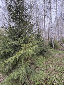 На участке ели, березы, сосны, участок ровный, правильной формы.