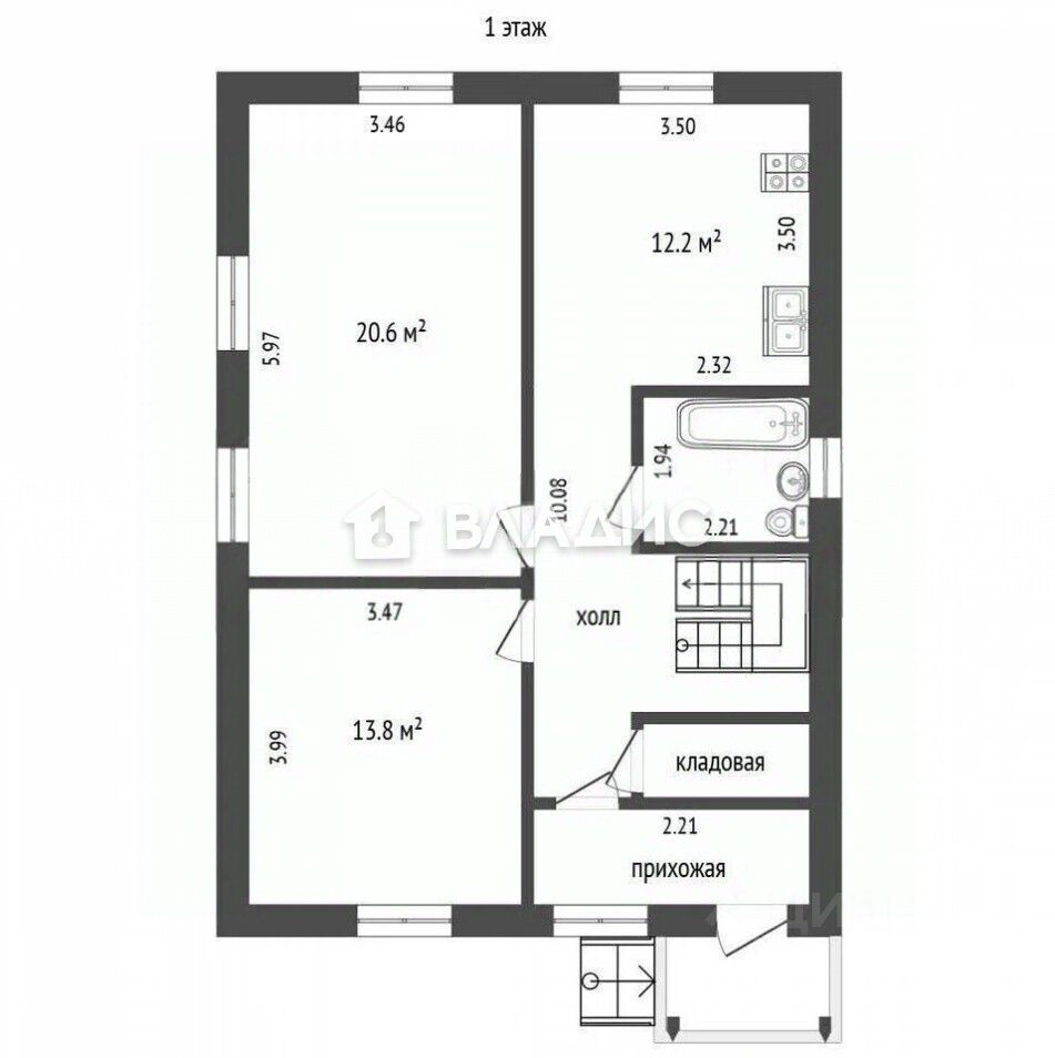 Первый этаж: 2 комнаты 20,6 кв.м и 13,8 кв.м, кухня 12.2 кв.м, кладовая, совмещенный санузел.