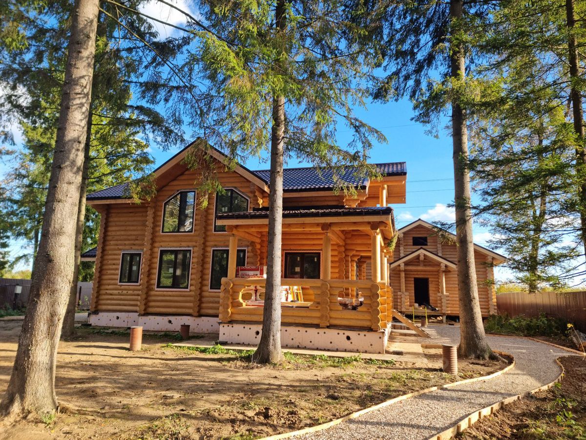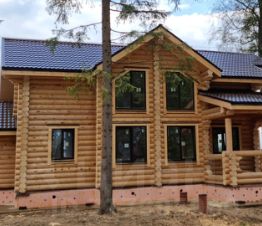 Фундамент дома выполнен в виде монолитной ленточной конструкции, что обеспечивает надежность и долговечность строения. Стены дома изготовлены из оцилиндрованного бревна диаметром 230 мм, что не только придает ему эстетичный вид, но и обеспечивает отличные теплоизоляционные свойства. Полы на первом этаже укреплены с использованием лаг размером 1000х2000 мм, выполненных из лиственницы, что гарантирует прочность и долговечность. Утеплитель, гидроизоляция и сухая стяжка создают комфортный микроклимат внутри дома.