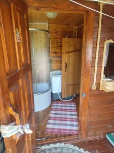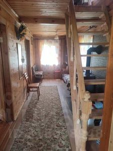 Есть электричество, горячая и холодная вода, септик, подключено спутниковое ТВ, отопление печное. Также на территории расположены баня (подключены ГВС, ХВС и септик), хозяйственные постройки, теплица, колодец, летний душ и туалет, зона паркинга на два авто, плодовые деревья, забор по периметру.