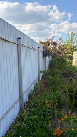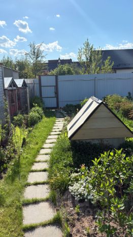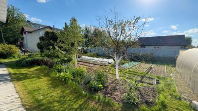 УХОЖЕННЫЙ УЧАСТОК-САД с большой дорогой теплицей и садовыми деревьями и кустарниками. Малина, ежевика, яблони, клубника и т.д. В центре участка декоративная карликовая сосна, можжевельник и много других интересных растений. Местами газон, дорожки и обход вокруг дома — плитка.