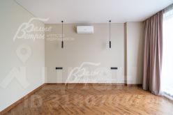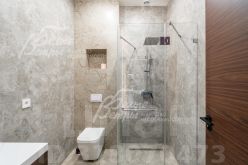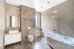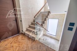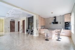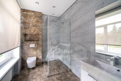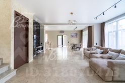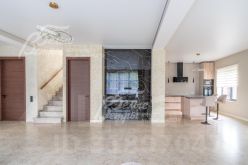 Описание внутренней отделки: интерьер выполнен в современном стиле в светло-бежевых тонах с использованием премиальных материалов и стильных дизайнерских решений. На стенах спален и общих помещений декоративная антивандальная штукатурка в 3 слоя, имитирующая камень травертин, керамогранит (в санузлах), имитирующий слепок ригеля черного цвета, покраска стен в комнатах. На полу крупноформатный керамогранит под мрамор на первом этаже и в санузлах на 2 этаже (под керамогранитом тёплые водные полы), инженерная доска (кладка елочкой). Установлены натяжные потолки, двери из шпона натурального дерева высотой 2,4 м, подоконники под мрамор, трековое освещение черного цвета и светодиодная подсветка, электрика Schneider Electric черного цвета, интернет проводной и ТВ кабель для точек и до рабочих мест. На второй этаж ведёт монолитная лестница: ступени из керамогранита под мрамор с капиносом, ограждение прозрачные перила с дубовыми поручнями. Гостиную украшает биокамин, отделанный керамогранитом.