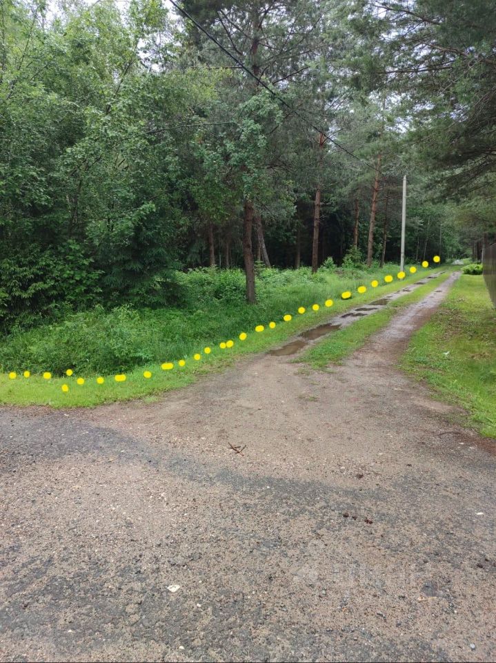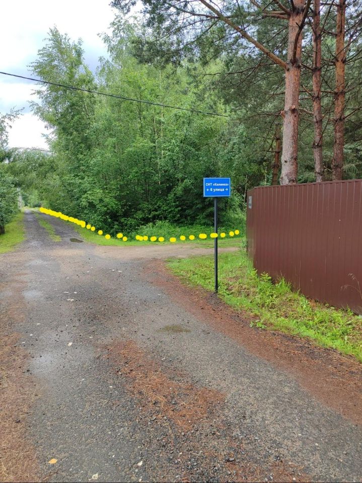 На фото наш участок выделен пунктиром, начинается после знака 6 улица (где сосны это наш) и продолжается до знака 7 улица, который виден с оборотной стороны.