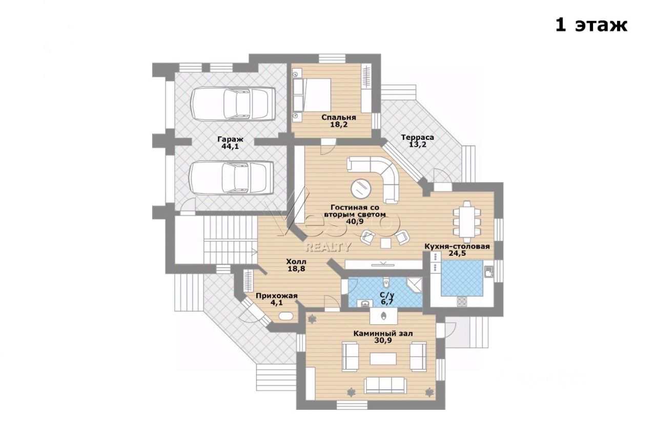 Прихожая (4), холл (19), гостиная со вторым светом (41), кухня-столовая (25) с выходом на террасу (13), каминный зал (31), гостевая спальня (18), гостевой с/у (7), гараж на 2 м/м (44).