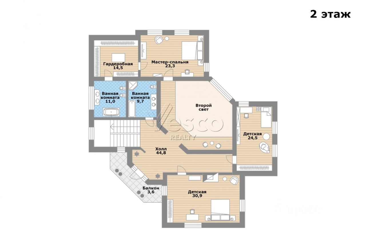 Мастер-спальня (23) с гардеробной (15) и ванной комнатой (11), детские (25 + 31), ванная комната (10), холл (45) со вторым светом и выходом на балкон (4).