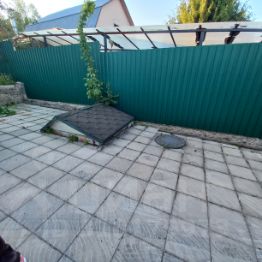 Участок правильной формы. Огорожен забором из металлических листов по кирпичным столбам. Есть калитка и откатные электрические ворота. Есть хоз. сарай. На участке выполнено зонирование террасами, есть искусственный прудик, выделена стоянка под 3 автомобиля.
