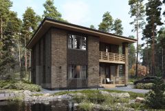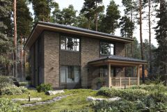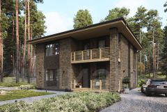 Современный дом из керамических блоков на свайно-ростверковом фундаменте. В проекте два полноценных этажа, большие окна и вальмовая кровля с покрытием BRAAS. Дом идеально подойдет для семьи с двумя детьми.