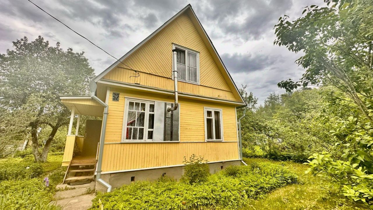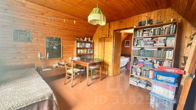 Дачный домик построен из бруса. В доме два этажа: 1-й этаж - две комнаты, гостиная, небольшая кухня, крыльцо; 2-й этаж - две уютных комнаты. В гостиной есть печь.