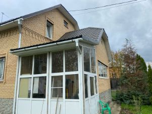Дом в два этажа + цокольный этаж + чердак обшитый вагонкой, с окном.