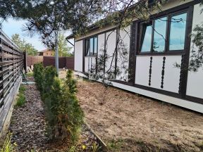 В доме : просторная гостиная 38 кв.м. для приема большой компании друзей, отдельная кухня, две уютные спальни, ванная с сантехникой, прихожая и небольшая веранда. Центральные коммуникации уже подключены (электричество 15 кВт, вода, канализация) газ с трубой низкого давления уже на участке.