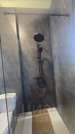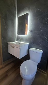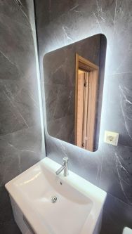 7. Душевая - дизайнерское исполнение (душевой поддон встроенный в пол, стеклянная перегородка 1м в ширину, унитаз, раковина встроенная в тумбочку, зеркало с подсветкой, стены - цвет, темный гранит)
