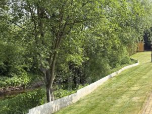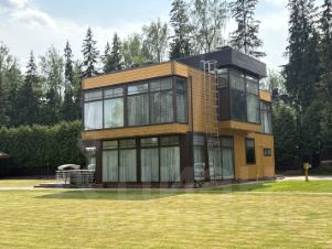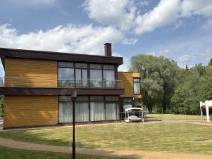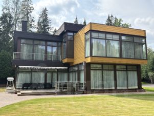 Современный дом из стекла, монолита и клеёного бруса расположен внутри третьей очереди посёлка, на отдельной огороженной и охраняемой территории на берегу реки Незнайки.
