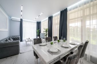 Большие окна, высокие потолки, более 3-х метров.
