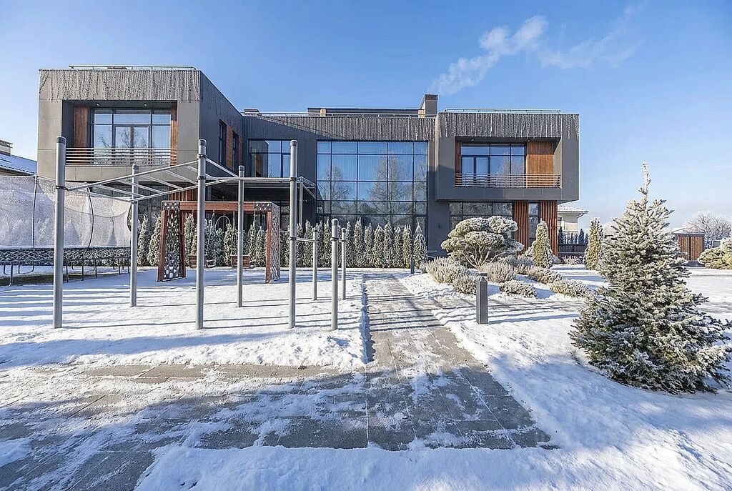 Дом с выходом в парк в элитном посёлке Millennium Park. Общая площадь - 1206 м2. Пространство разделено на три этажа и цоколь, в котором располагается автомобильная парковка и подсобные помещения.