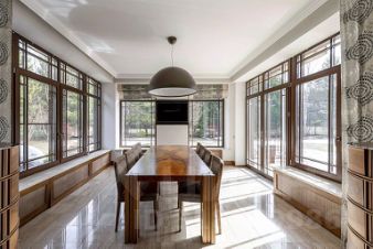 На первом этаже расположена роскошная гостиная с камином и витражными окнами высотой в два этажа. Столовая выходит на крытую террасу, выполненную из натурального дерева. Зимний сад, окружённый панорамными окнами с трёх сторон, выходит на открытую террасу. В кабинете с отделкой из ценных пород дерева расположена рабочая зона, окружённая с двух сторон большими окнами. Гостевая спальня расположена в уединённой части.