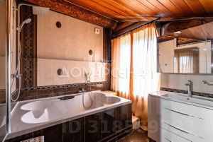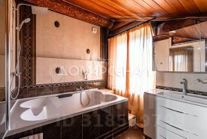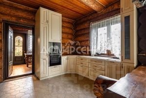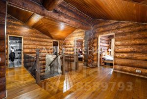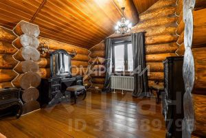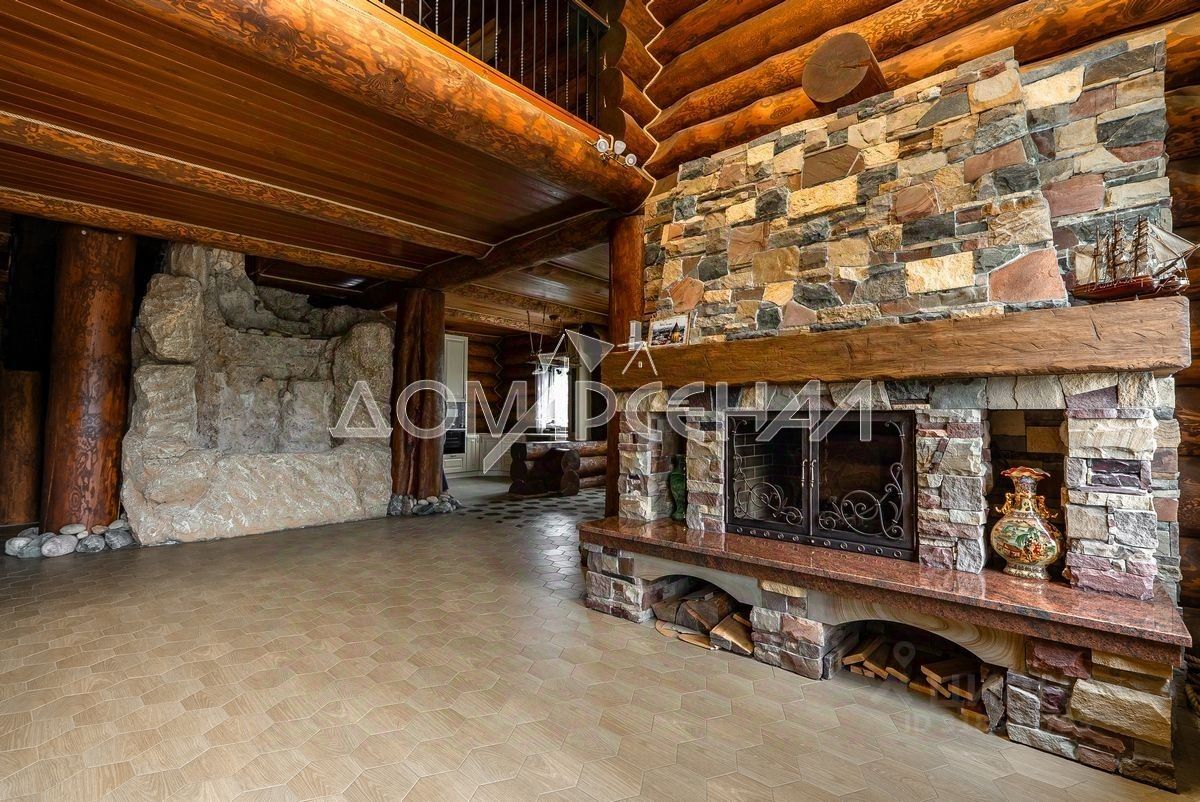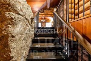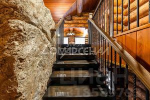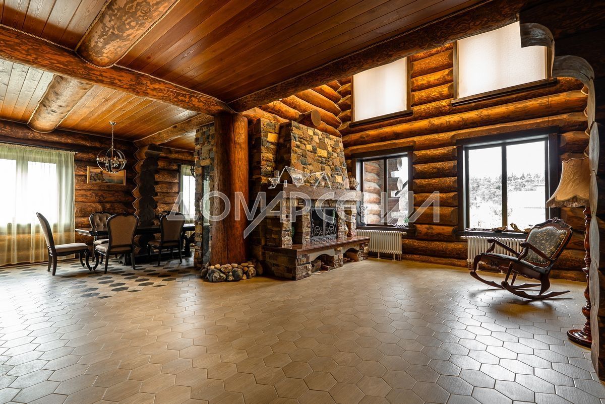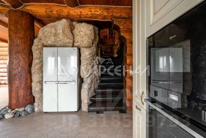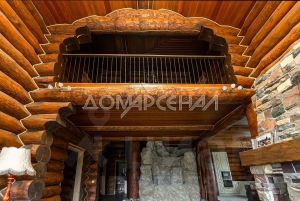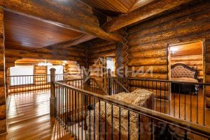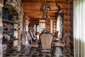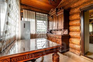 1 этаж: Светлая прихожая и холл ведут в центральную гостиную, впечатляющую объёмом пространства (высота потолков — 7 м), украшенную большим камином, с панорамными окнами, из которых открывается великолепный вид на лесной массив. Водопад из арт-бетона, выполненный по дизайнерскому проекту, наполняет воздух необходимой влагой. Кухня-столовая с гарнитуром из массива дерева и техникой NEFF имеет элементы врубленного в интерьер кухни бревна с подчеркнутым неповторимым узором, которое создаёт антураж эксклюзивности и уникальности. Слева от входа в гостиную расположены спальня/кабинет, санузел и кладовое помещение. В столовой установлен изящный семейный обеденный стол со стульями на 12 персон в стиле американской классики. Вторую столовую, имеющую выход в сад, украшают стол и буфет XIX века, выполненные также из массива дерева.