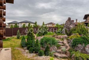 Гармоничное сочетание элементов природного рельефа и рукотворных шедевров искусства. Искусственные скалы из арт-бетона создают ощущение настоящего каменистого массива швейцарских гор с журчащим водопадом. Эти природные мотивы подчеркнуты элегантными посадками вечнозелёного можжевельника. На участке высажены более 150 растений, включая плодовые деревья и живую изгородь из туй, выполнена дренажная система. Фасадная часть забора из гиперпрессованного кирпича, установлены ворота. Забетонирована площадка для навеса с основаниями для установки столбов, забетонирована мангальная зона.