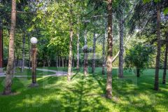 Участок правильной формы с лесными деревьями, на участке отдельно расположен дом охраны, крытая беседка-барбекю.