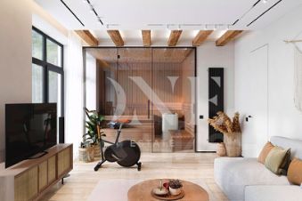 холл, кухня-столовая-гостиная, с/у, спальня/кабинет, гардеробная, постирочная, сауна с комнатой отдыха и с/у.